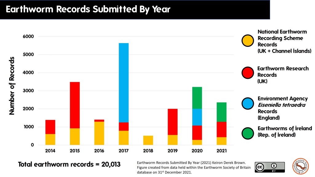 The good news is, that partnerships with research institutions and extracting data from scientific literature have continued to provide the Earthworm Society of Britain (ESB) with exciting new data though our Earthworm Research Records (UK) and Earthworms of Ireland (Rep. of Ireland) datasets – contributing a significant amount of the data received this year (and taking up the majority of my ‘earthworm time’).