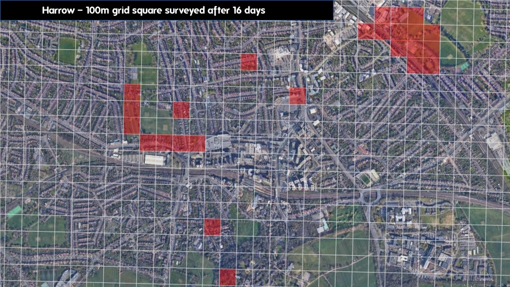 - I live in a very urban area (Harrow), meaning that accessible greenspace is fairly limited (see map below including highlighted grid square showing the grid squares within my local area that have been sampled to date) and finding new records near to where I live will get harder and harder as the year progresses.