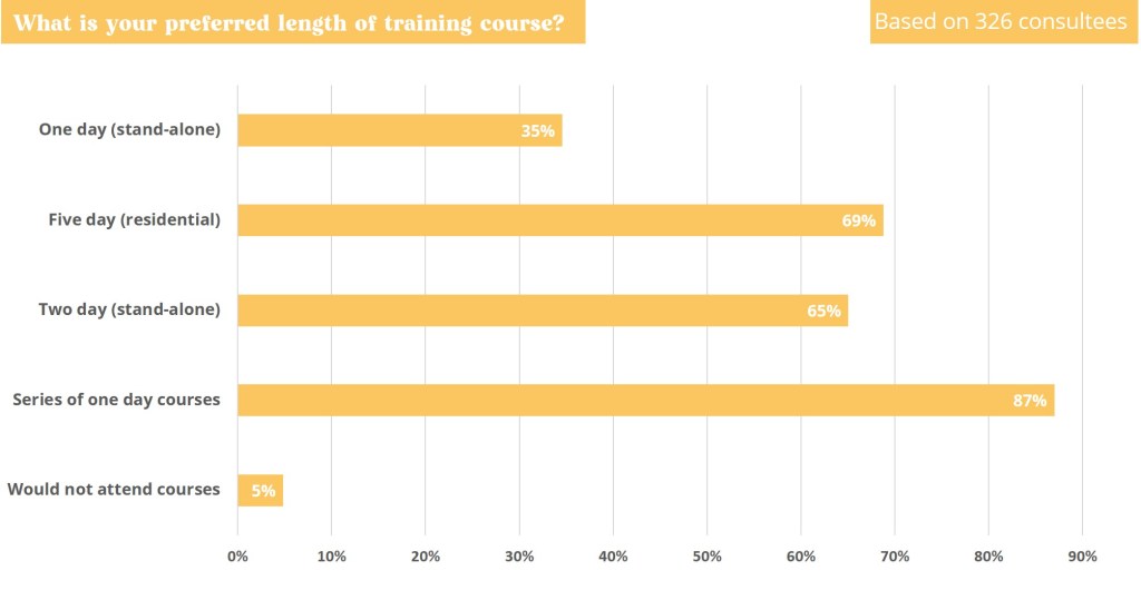 Online survey respondents showed a clear preference for training that allowed more time for knowledge and skill progression (see Figure 7), with a series of one-day courses being the most popular option and stand-alone one-day courses the least popular. This highlighted the need for a structured training programme that considered progression in a similar manner to professional CPD training programmes.