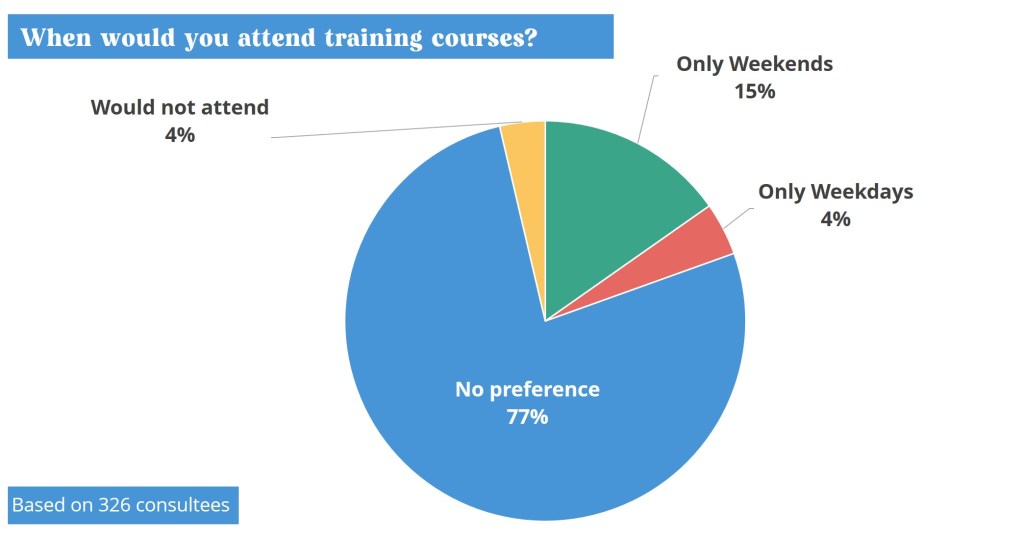 Sector professionals often articulated an assumption that training opportunities should be delivered during the weekend in order to ensure good attendance. The online survey demonstrated that this assumption was not true (see Figure 8), with 77% displaying no preference, 15% only weekends and 4% only weekdays. This highlighted the need for a variety of scheduling options to account for differing availability between individuals.