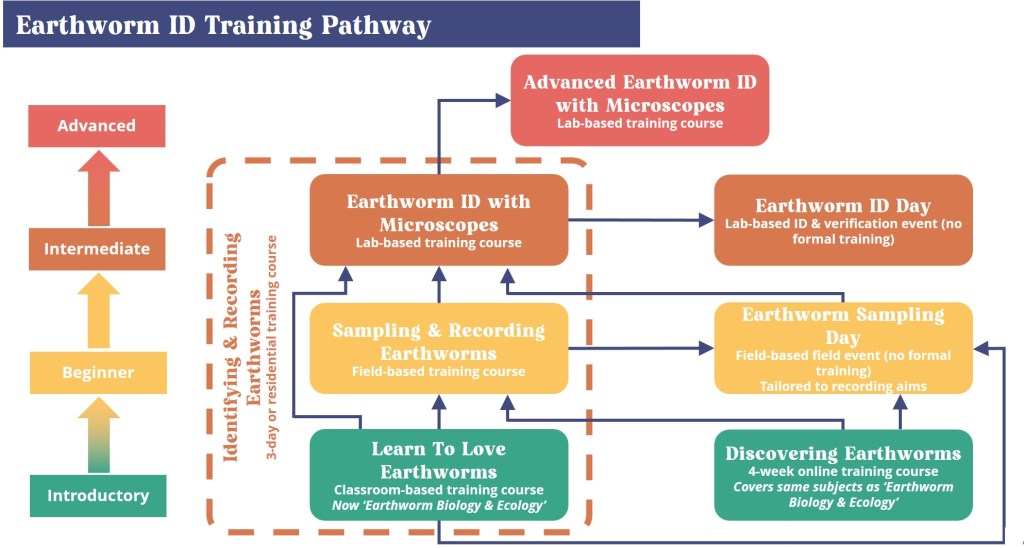 For each of the focus species groups identified for inclusion within the project, draft structured ID training pathways were created, identifying the courses that could be included and which levels these would sit within (see Figure 10 for earthworm example). These structured training pathways were not designed to be comprehensive (particularly for large species groups such as beetles, true bugs or true flies) and it was expected that they would evolve throughout and beyond the project. Provision of the courses within the pathways was not restricted to project activities, and other training providers were welcome to incorporate these courses within their training programmes so that BioLinks could focus on filling gaps.
