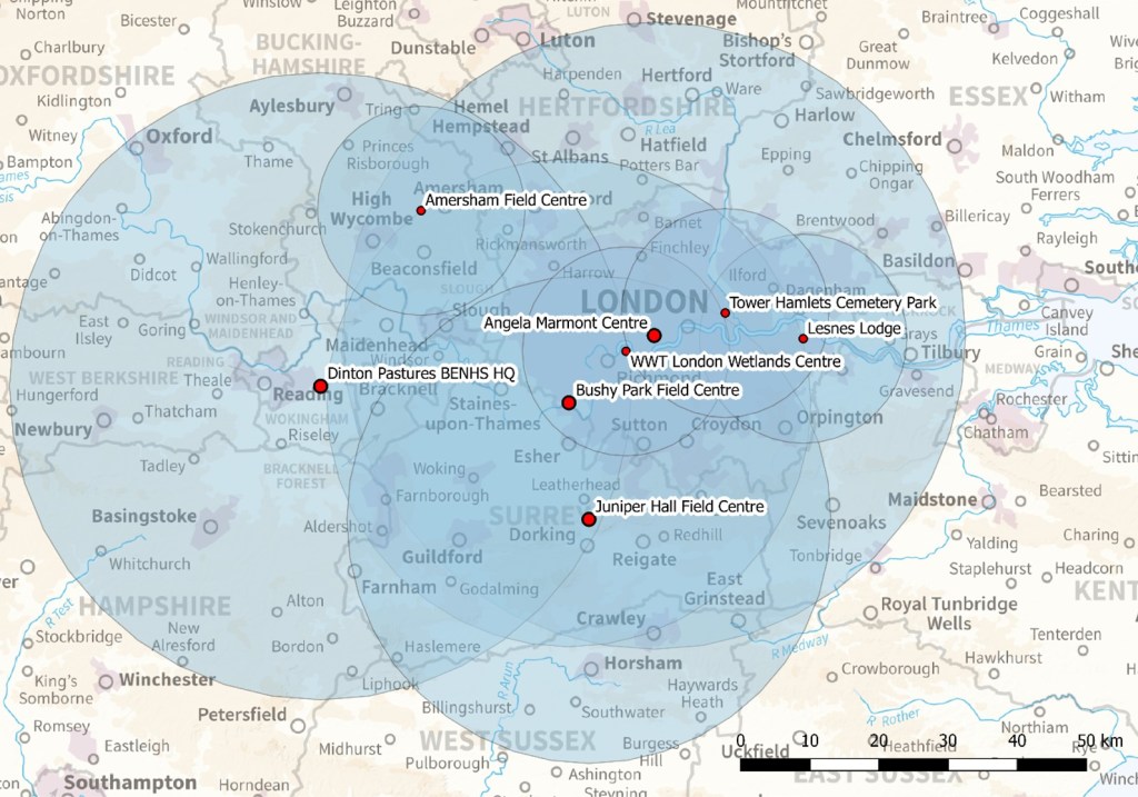 There was interest from a wide range of external training facilities so it was also decided that these could act as outreach training facilities and host introductory courses to help recruit local volunteers and encourage them to travel to the main hubs for further training (see Figure 6 for an example of the predicted project area and hubs within the South East England region).