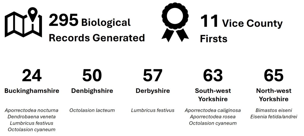 In addition to the primary of aim of generating a training image library, the Earthworm Sampling Day programme also benefited the National Earthworm Recording Scheme by generating 295 new species occurrence records, including 11 instances where species were recorded for the first time within a Watsonian vice county. It also engaged new people with earthworm recording, resulted in specimens being added to regional and national museum collections and