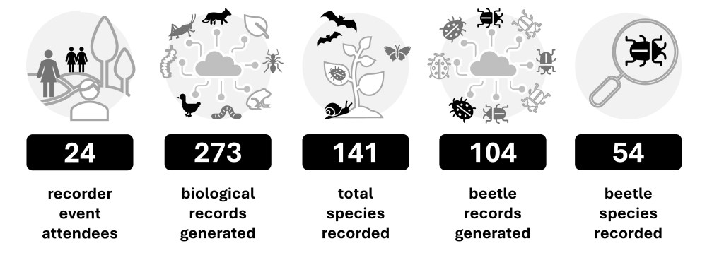 All in all it was a very productive day with 24 volunteers engaged and 273 biological records generated of 141 species in total, including 104 records of 54 species of beetle.
