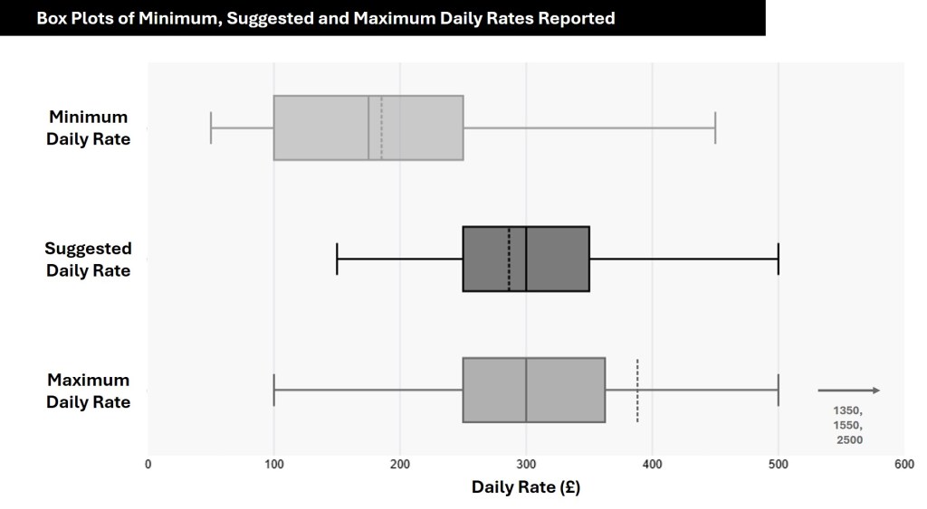 Respondents were advised that “we understand that daily rates may vary by experience level, product, subject and target audience so please provide a rate that you think recognises your expertise and skills”. They were also reminded that minimum wage for those aged 23 and over was £83.36 for the average (8-hour) working day so they could not enter a figure lower than £84.