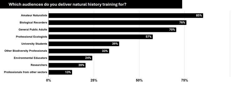 Respondents were asked to select which adult audiences they had delivered training to from a list of 9 adult audience categories. They were advised to only select categories where the training that they had delivered was designed for that audience and asked to refrain from selecting all boxes for general interest courses (e.g. not to select ‘Researchers’ because some PhD students had attended courses that were designed primarily for biological recorders and amateur naturalists).