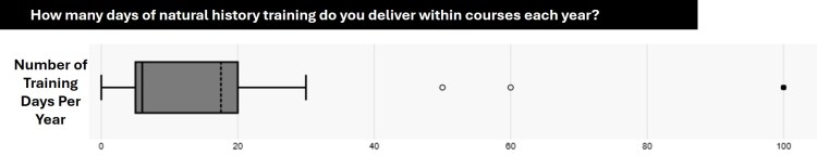 Reponses varied from 0 days (indicating delivery of training less frequently than annually) through to 100 days (indicating that natural history training delivery accounts for a substantial component of the the respondents’ profession). Overall, the mean number of days was 18 days and the median was 6 days.