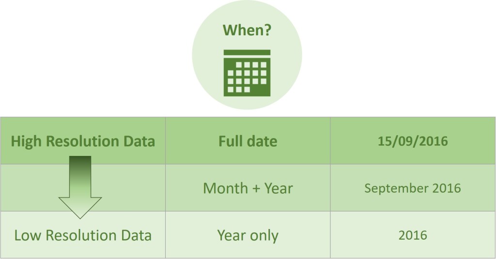 Therefore, the resolution at which data is submitted should never exceed the resolution at which is was recorded. For example, if a recorder wasn’t sure what date a record was made on, they should provide an accurate date range, month or even year rather than guessing the date for the record.