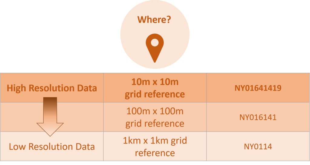 Use the most accurate geographic resolution appropriate for the record. Using the UK Ordnance Survey system, an 8-figure grid reference details that the species was seen within a 10m by 10m square. Whereas, a 4-figure grid reference details that the organism was seen in a 1km by 1 km square – which may be useful for birds or other organisms that travel large distances, but not useful if it’s a record of a plant.